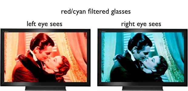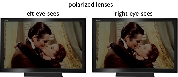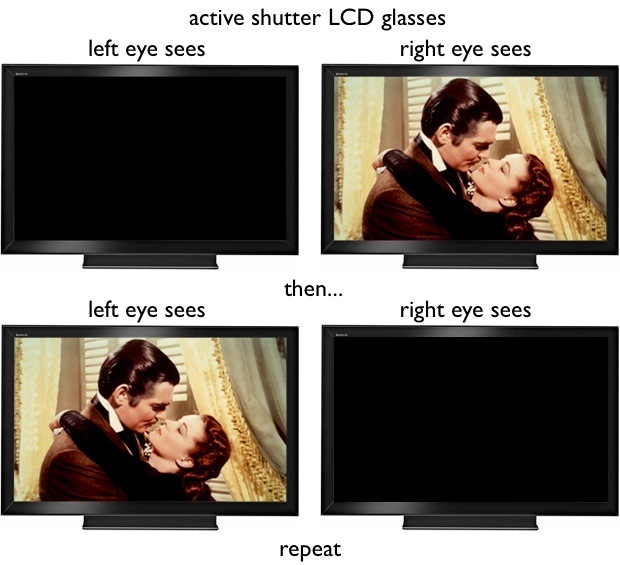 This is the current method of choice for most 3D TV companies. The media is displayed at a high framerate, and the glasses rapidly switch between black and clear using a pair of low-latency transparent LCD screens. In this way, one eye sees nothing (for as little as a hundredth of a second or so) while the other sees its “correct” image, and a few microseconds later, the situation is reversed: the opposite eye’s image is displayed and the LCDs have switched. The benefit is that each eye is getting the “full” image whenever it’s getting anything (unless they’re cheating and doing it via interlaced field switching).