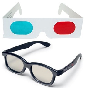 The original. The red-blue, red-green, or magenta-cyan (or “anaglyph,” the coolest word in this story after “parallax barrier”) glasses that came to symbolize 3D split a black-and-white (and later, color) image into two complementary components. I won’t get deep into the mechanics of it (Wikipedia has an excellent entry) but basically it creates an image where part goes to one eye and part to another, and part to both — this last part will be the screen’s “normal plane” where your eyes are to focus, and hence receive similar input. Troubles are mainly of the color perception variety; it’s extremely hard to balance things so that your brain takes the broken-up colors and assembles them correctly. However, anaglyph is still in use and still relevant — I just watched Toy Story 3 using green-magenta and it looked great. A newer version (by Infitec) uses advanced filters to split each color into two components, sending half the red spectrum to one eye and one to the other,