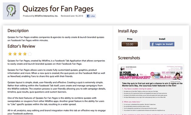 Through Appbistro, Wildfire is now offering five tab applications, including tabs for contests, coupons, and quizzes. As with all its developer partners, Appbistro does a 30/70% revenue split in the developer’s favor.