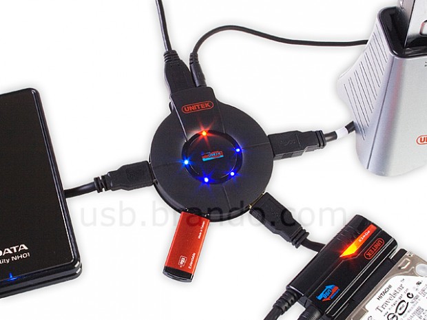 The hub is your normal star-shaped model with four ports wrapping a round hub and a series of indicator lights up top. It supports both USB 3.0 and USB 2.0. $48.