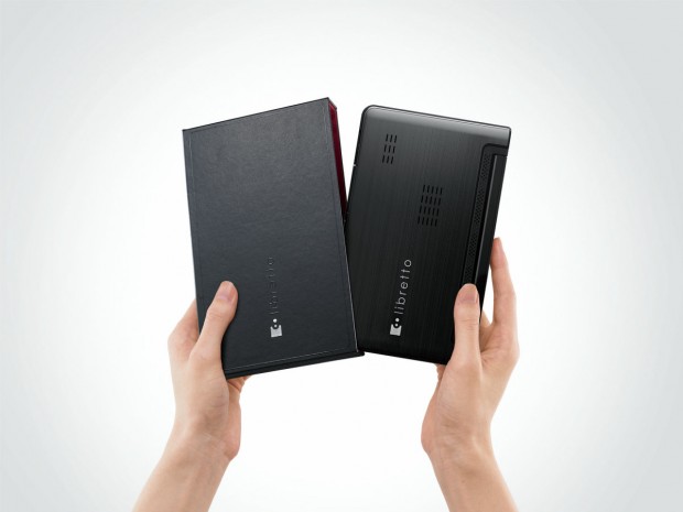Pitched as the “world’s first dual touch-screen Windows mini-notebook PC”, the device is sized at just 202×123×25.4mm and weighs 699g (battery included). It can be used both horizontally and vertically (thanks to the built-in accelerometer, it can be turned into an e-reader – as shown above). The battery life is pretty disappointing though (2 hours with standard battery, 4 hours with high-capacity battery).