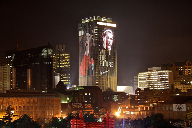 Looks like Nike is up to quite a bit more in South Africa than making sure Landon Donovan (and the rest of Team USA) is well-dressed while taking first place in Group C. (Fingers crossed!) I just got word that the company has constructed the biggest interactive LED screen in the whole of Africa. It’s on the Life Centre skyscraper that’s in Johannesburg. Now, what would you want to do with an giant interactive LED screen in the middle of a major city?