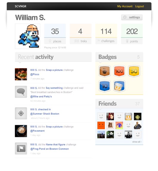 Along with profiles, the service is also boosting its sharing functionality. SCVNGR CEO Seth Priebatsch says that the app’s initial integrations with Facebook and Twitter were weak — now it will be easier to share your stories out to the social networks. But instead of broadcasting everything you do to these services (which is incredibly annoying), SCVNGR will use some intelligence to only share the ‘higher quality’ stories (assuming you connect your Facebook or Twitter account). Priebatsch also says that a lot of emphasis was placed on the page’s clean design, and the result does indeed look quite nice.