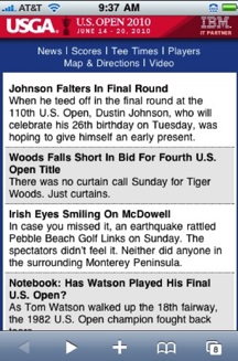 In other words, nearly 30 percent of traffic to the U.S. Open site was from mobile devices. The fact that golf fans didn’t need to fire up their laptops or turn on their TVs to find the latest scores and keep up with the play was enough to make the mobile site take off. And the mobile site was pretty stripped down—there was an all-text news feed, scores, tee times, and some video.