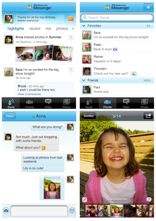 Use your iPhone to instant message your friends list, view and comment on your friends’ photos and status updates from Windows Live, Facebook, and MySpace, and at a glance, see what your Messenger friends are sharing from Flickr, YouTube, and many other social and photo sharing sites.