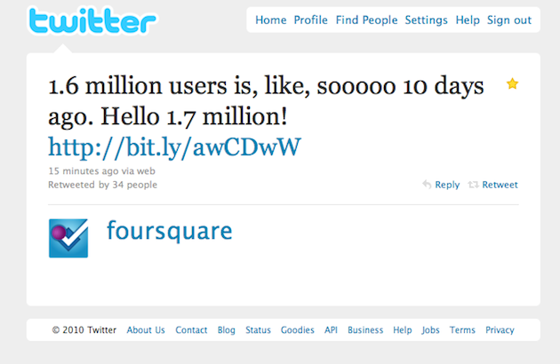 The location-based service has just tweeted out that they’re now past 1.7 million users. Impressively, that’s up 100,000 users from just about a week ago. Also impressive from this angle, it was only two months ago that Foursquare passed one million users — clearly the rate of growth is increasingly quickly.