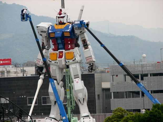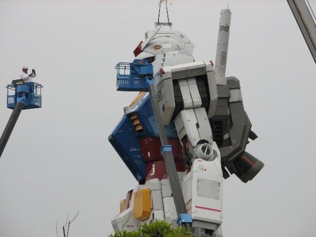 We spent quite a few posts on the uber-cool, gigantic Gundam statue that was erected in Tokyo Bay last year. The 60-foot robot statue was deconstructed in September, with Bandai quickly announcing plans to re-erect the big guy in Shizuoka soon. And now he’s almost ready.