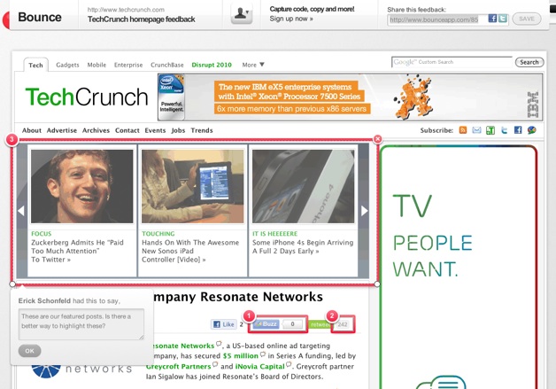 Bounce is very simple. You enter a URL and it goes and grabs a screenshot, which can then be annotated with red rectangles and comments. You draw a rectangle around the part of the page you want to comment on, then add and save your comment. Then you send the newly created link to anyone you want to share your comments with via Twitter, Facebook, or email. They can add their own comments and so on. For instance, here is one showing the TechCrunch homepage.