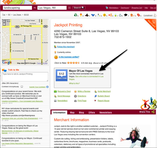 Hyperlocal business directory MerchantCircle has been steadily growing its business directory for merchants in smaller towns. MerchantCircle has long targeted merchants in small locales versus catering towards the consumers, as sites like Yelp and CitySearch do. Today, MerchantCircle has launched a new social gaming program, “MerchantCircle Mayors,” which identifies and rewards the most connected members within the MerchantCircle network with mayorships.