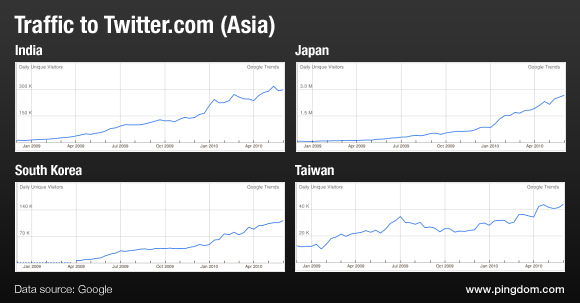 Pingdom took a look at Google Trends for Websites traffic data for Twitter.com to see where the service is experiencing the fastest growth in terms of monthly usage. Again, that means its findings are far more fit for deducing overall trends than they are able to accurately detail Twitter’s user numbers, since a lot of people use desktop and mobile clients for tweeting.