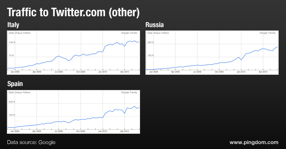 In Europe, too, Twitter seems to be attracting an increasing amount of visitors to its website, particularly in Italy, Spain and Russia. These three countries have a combined 104 million Internet users, claims Pingdom.