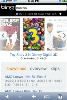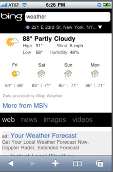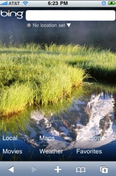 The new mobile web site looks gorgeous in the iPhone’s mobile web browser (as well as on Androids, Palms, Windows phones, Kins, and Zunes). It looks more like an app, with simplified menu buttons along the bottom (local, maps, directions, movies, weather, favorites) and smooth scrolling in maps. The homepage features Bing’s signature background photo, which looks great on an iPhone screen). And right under the search box, you have the option to “Locate me.” It was able to find my exact street address immediately, something which Google’s mobile web search was having trouble with for me (I had to manually enter my zipcode to get local results). Once you let Bing locate you, it remembers your location on subsequent searches.