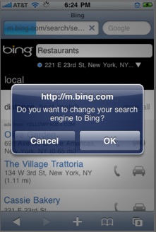 Bing is on a roll. Yesterday, it released Bing Entertainment and a new iPhone app. And today it is following up with an update to its mobile web search at http://m.bing.com. Bing only recently became a search option on the iPhone, but it really wants to become your default mobile search engine. In fact, if you are not careful, Bing will take over as your default search engine the first time you use it on your iPhone. A message box pops up asking you, “Do you want to change your search engine to Bing?” (Yahoo, the other search options, is using the same notification). Once you do, the hope is there will be no going back.
