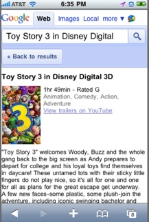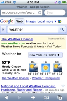 Hit “Movies” to see a list of flicks playing nearby, click on a title to see individual showtimes, an overview, or even trailers. Instead of hitting the back button to find more movies, you can simply scroll through the movie poster thumbnails in the top third of the screen. Who needs an app? Google’s mobile search for movies pulls up similar information, but it is all laid out an endless-scroll format with too much white space. It just doesn’t look as good. And as we all know, on the iPhone, looks matter. When I try “Weather,” again Google has trouble locating me and it ends up giving me the wrong temperature.