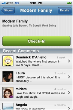 You can also share check-ins with your Twitter and Facebook friends, rate lists of popular shows, movies, music and books, receive weekly new releases and customized recommendations, and access existing reviews, clips and ratings for 20 million movies, books and albums.