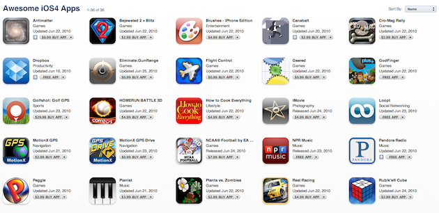 Apple has singled out 36 apps that it dubs “Awesome iOS 4 Apps” to get you started with the new OS. Not surprisingly, they highlight many of the ones we highlighted last weekend right before the OS came out. Included here are are apps such as Pandora, Dropbox, Twitter, Loopt, How To Cook Everything, and GodFinger.