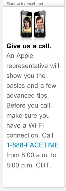Now, however, you can call 1-888-FACETIME (188832238463) and talk to an Apple rep live over Facetime. They’re available from 8am to 8pm CDT. I tried it. It actually works.