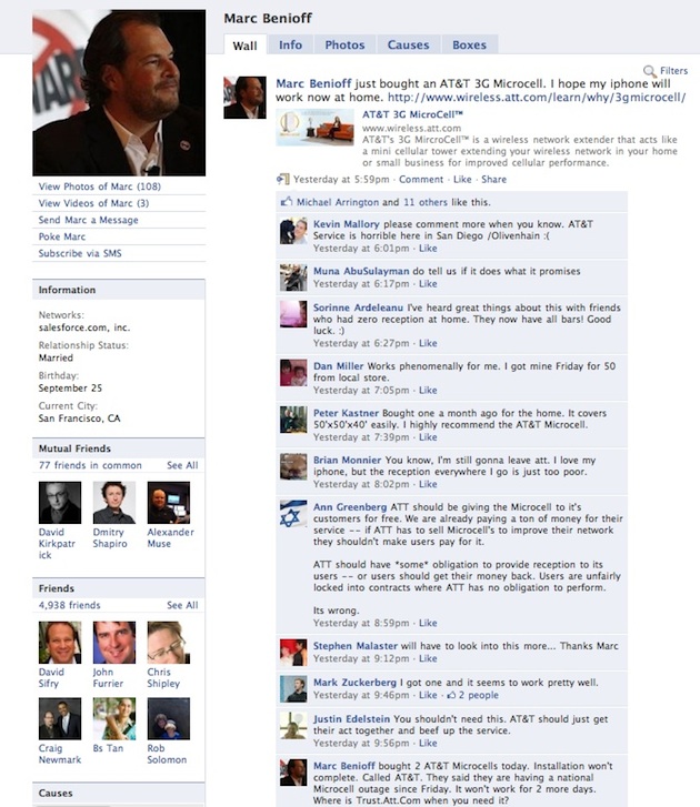 “I got one and it seems to work pretty well,” Zuckerberg wrote in a comment under Benioff’s post. “Pretty well” isn’t exactly a rave review, but AT&T will undoubtedly take it from Zuckerberg. But Benioff had a different experience. “Bought 2 AT&T MicroCells today. Installation won’t complete. Called AT&T. They said they are having a national MicroCell outage since Friday. It won’t work for 2 more days. Where is TrustAtt.com when you need it?,” Benioff wrote on his wall. Other posts confirm AT&T acknowledging the outage.