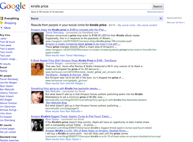 Starting today and rolling out over the cource of this week, Google will begin looking at items you share on Buzz and crawling elements from those social networks to use in Social Search as well. For example, if you link up your Twitter feed to your Buzz page, even if you haven’t linked it to your Google Profile, you’ll now start seeing results from your Twitter social graph in the results.
