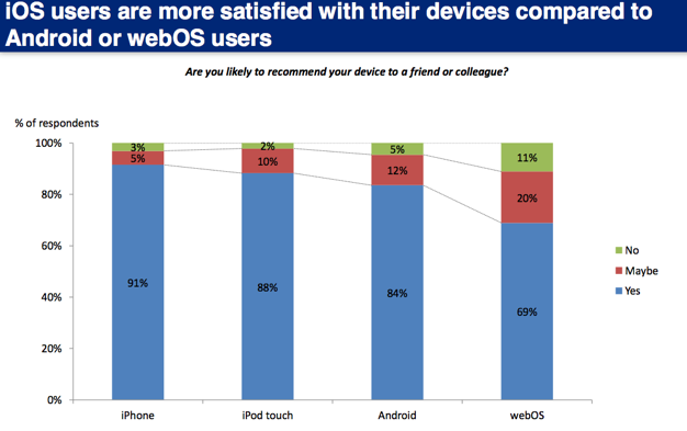 On a worldwide basis, Apple devices still outnumber Android in terms of mobile ad impressions by a factor of almost 3.5 to 1. In the U.S., that ratio is about 2 to 1. According to an AdMob survey, iPhone users are more satisfied (91 percent) than Android (84 percent) or Palm’s WebOS users (69 percent). Android’s 84 percent satisfaction is pretty good, but there is still a gap with the iPhone.