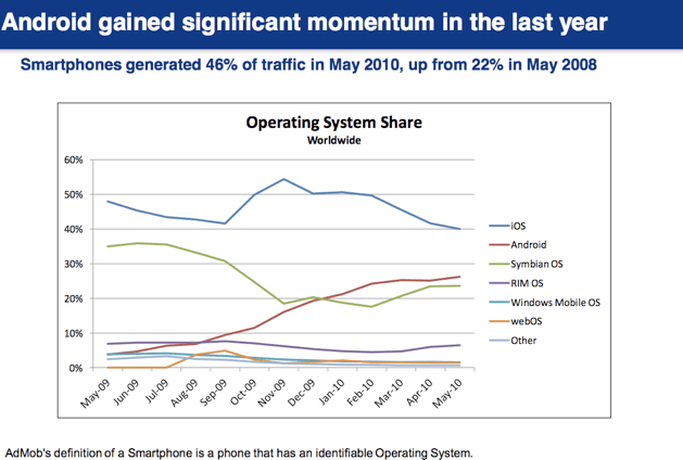 Mobile ad network AdMob (now part of Google) released its final Mobile Metrics report today (embedded below), at least for a while. AdMob gathers data from millions of phones and mobile devices which serve up its ad impressions, including almost 44 million iOS devices (iPhones, iPod Touches, and iPads). The decision to stop disclosing the data may have something to do with its new owner, Google, wanting to assess what it wants to let out there, but it could also be tied to the fact that AdMob might no longer have access to any iPhone data since Apple is specifically threatening to block it.