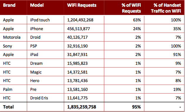 - WiFi is huge. Nearly a quarter of U.S. mobile traffic comes over WiFi. The biggest percentage of WiFi requests (nearly two thirds) comes from the iPod Touch—which is a WiFi-only device—but 35% of iPhone traffic goes over WiFi as well