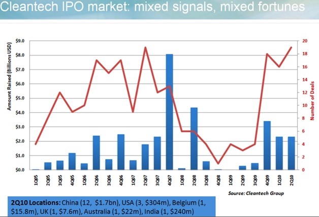 Exits for the quarter totaled more than $8 billion globally, with $6 billion in cleantech M&A and $2.3 billion in cleantech IPOs. Tesla‘s $202 million IPO has been in the spotlight recently, but globally, the cleantech IPO market is concentrated in China, which grabbed $1.7 billion, 75 percent of the $2.3 billion raised worldwide in the past three months, and 12 of the 19 IPOs, though not all of those are venture backed. The biggest IPO of the quarter was China’s Origin Water on the Shenzen Stock Exchange, which raised $330 million. As a point of comparison, in the U.S. alone, IPOs across all sectors totaled $900 million in the second quarter.
