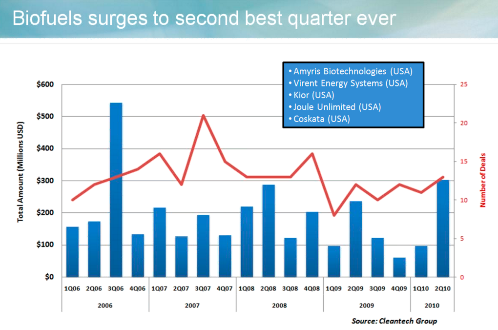 Investment in biofuels was also strong, soaring to $302 million since the the first quarter.