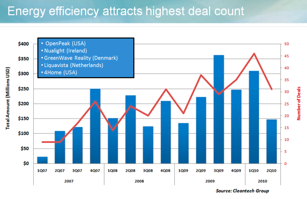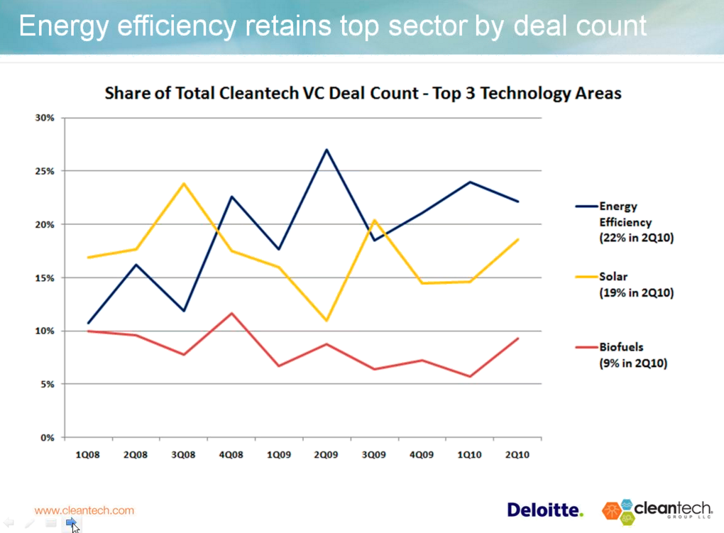 Spurred by the recession, investors are spending money on companies that can save money. Energy efficiency boasted 31 rounds of funding, trumping solar’s 26 and biofuels’ 13 deals.