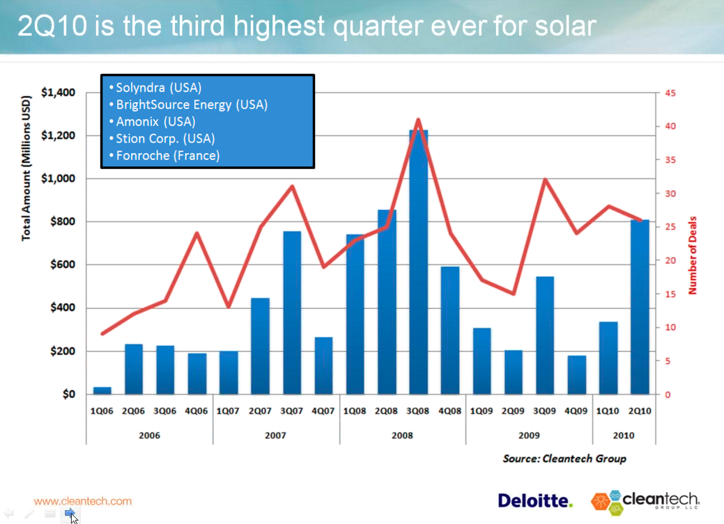 The industry sectors drawing the most dollars were solar, biofuels, and smart grid. Solar is one of the industry’s brightest shining stars, grabbing $811 million to mark its third highest quarter in history.