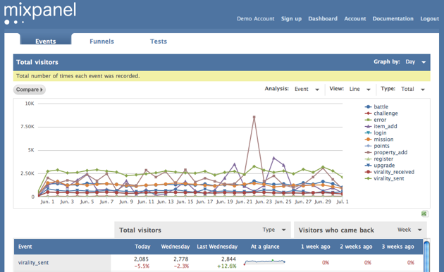 Mixpanel was built by former Slide employees, who took their experience with that company’s extensive analytics tracking and built tools that other developers can integrate into their own applications. These datapoints can include pretty much anything a developer wants to track, from the number of pages a user has viewed to how many virtual cows they’ve thrown in a Facebook app. Cofounder Suhail Doshi says that the volume of data the site tracks grew 185% last month alone (you can see the growth chart below).