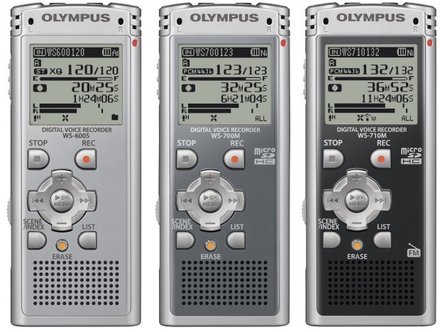 No, you’re not seeing triple — those really are three totally different models of voice recorder from Olympus. Well, they’re not actually that different. Core functionality is largely the same between them: a few gigs of internal storage, rechargeable AAA battery, built-in stereo mics, and a monochrome LCD screen (now bigger!).