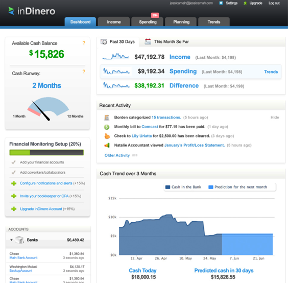 Like Mint, Indinero uses Yodlee to allow businesses to transferring bank and credit card account information from financial institutions. But Indinero’s site caters to the financial health and needs of small businesses, breaking out data that addresses cashflow, runway, spending, profits and more.