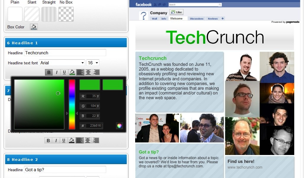 This time I don’t really need to explain how to create the page because it is really fairly easy. Once you log in with your Facebook account, you’ll be able to create a new page where you’ll be taken to a self-explanatory editor to help you achieve your page tab. You can choose between two layouts, and start your page (or tab if you wish) creation. Just enter all the information needed. You can add pictures, change the colors & font, and more. Finally, you’ll be asked to choose a Tab – ‘Welcome’ or ‘About us’ (more tab names are coming) And install it on your Facebook page. If you have more than one page, you can create a tab for each, and come back to edit them whenever you want through your account at Pagemodo.