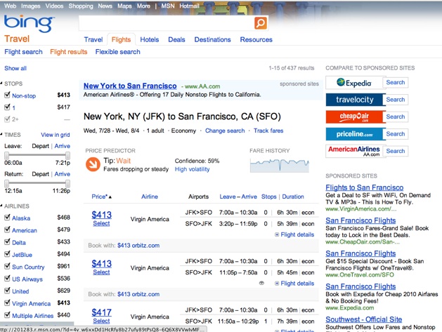 Does this mean that Google is becoming more of a destination portal? Not exactly. For a hint at what Google Travel might look like, take a peak at Bing Travel. Bing licenses ITA’s data, making it easy to search for flights by entering the cities you want to fly between. It gives you most of the data you need to make a decision (price, airline, departure and arrival times, number of stops), but then sends you to Orbitz or directly to an airline Website to make the purchase. (See screenshot below).