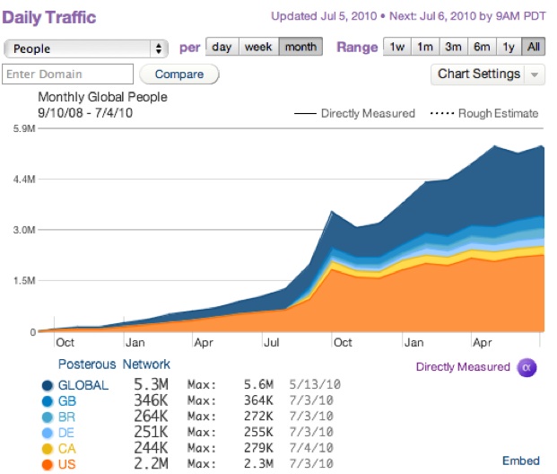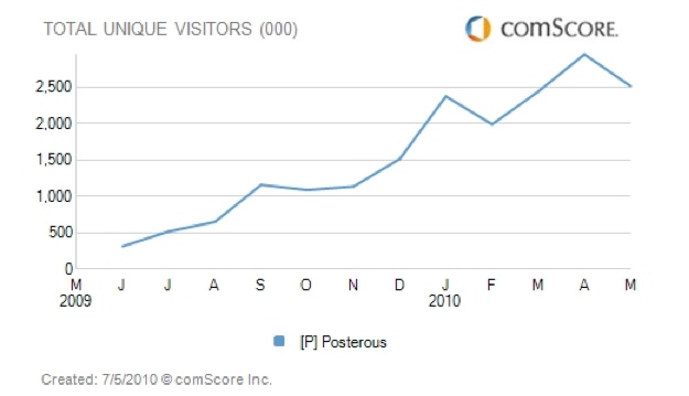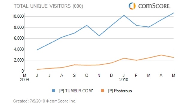 Even taking the more conservative estimates from comScore, which shows Posterous with only 2.5 million worldwide unique visitors in May, 2010, the site is up 700 percent since comScore started collecting data 11 months prior. It is safe to assume that the annual growth is north of 700 percent. Tumblr, by comparison, is up 174 percent during the same period (off a much larger base of users, which comScore estimates 10.7 million worldwide unques in May, 2010). Both are growing spectacularly because when you lower the barriers to publishing, the posts (and audience) will follow.