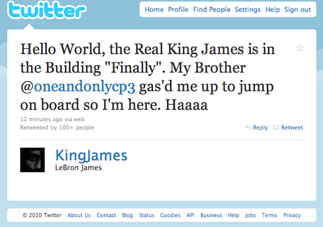 Instead, James uses his first tweet to acknowledge that it’s really him (though Twitter still hasn’t verified the account, I suspect they will soon), and notes that it was fellow NBA star Chris Paul who got him to sign up. Here’s the tweet: