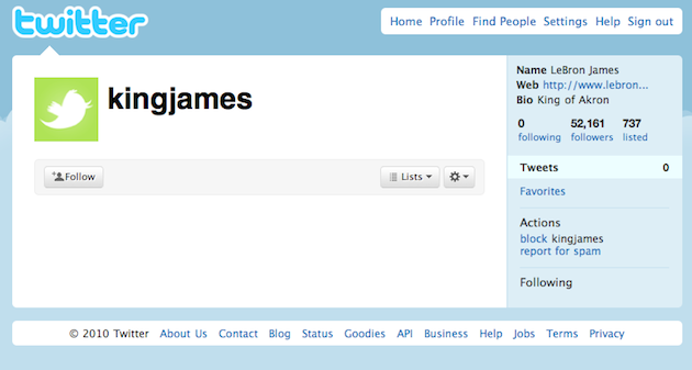All indications are that James has just joined Twitter under the name KingJames. It’s not a verified account yet (we have a message into Twitter about that — they’re looking into it), but the best indication it’s real is likely from fellow NBA star Chris Paul — who is James’ best friend in the league. Two hours ago, Paul tweeted out, “**Couldn’t convince him to tell me which team he’s goin to but convinced him to join twitter lol…my brother from another mother @KINGJAMES“.