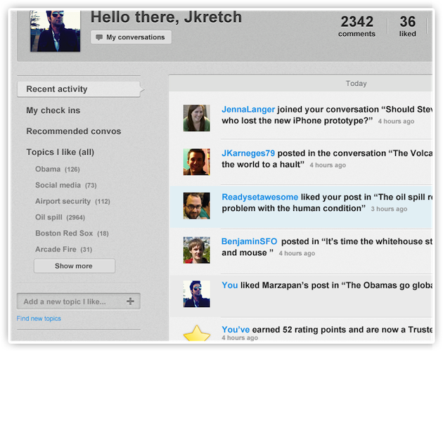 You’ll also be able to “check-in” to conversations on livefyre.com to follow topics you’re interested in. This is more like the original version of Livefyre, and it allows you to track conversations happening without having to watch individual blog posts. The idea sort of reminds me a bit of the aforementioned FriendFeed.