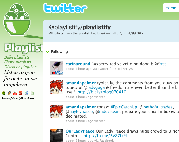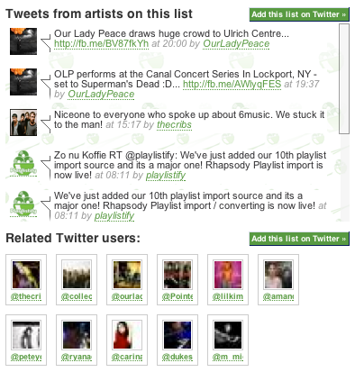 Playlistify uses the information available on Freebase to enrich the playlists with the official Twitter accounts. The startup also retrieves Facebook, MySpace and official Web pages via Freebase, and displays these on the playlist pages whenever available.