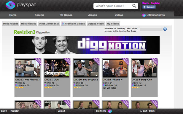 Playspan has already signed up a popular premium content publisher, Revision 3. Web shows like Diggnation, Chad Vader, and Turbo Dates are all being sold on PlaySpan’s platform. For example, you can preview an episode of Diggnation for 3 minutes but after that time period you need to pay 10 UPoints (the marketplace’s virtual currency) to view the remainder of the video. To give you a sense of the pricing, 1,000 UPoints costs $10 on PlaySpan.