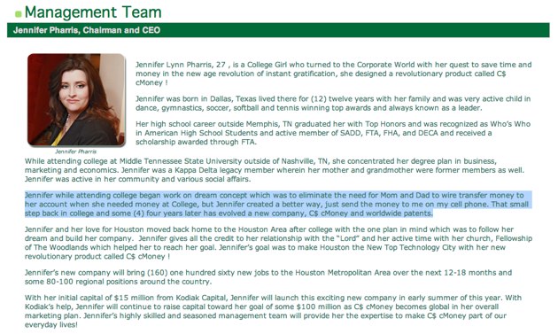 More significantly, in April of this year, cMoney entered into a “technology license agreement with Global 1 Enterprises, Inc. Under the agreement, C$ cMoney will pay Global 1 $1,500,000 per year for an exclusive and non-transferable license to certain intellectual property included trademarks and patents. Global 1 is owned by Jennifer Pharris.” Thus, to spell it out slowly, Pharris is charging cMoney hefty fees for the rights to license the technology from her other company. It’s hard to estimate what her cut is from this deal, but I imagine it’s a substantial amount (there was no reference online of any other executives at Global 1). For a company that is still bleeding cash, it’s strange for Pharris to charge such a high premium to access technology.
