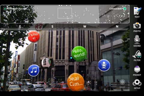To recap, Sekai Camera makes it possible to create text messages, photos, and audio recordings (dubbed air tags) and “drop” them on the spot in the form of floating bubbles and icons. Other users in the vicinity who open the app and spin the camera around can then click on and interact with those geo-tagged virtual Post-It notes. Sekai Camera is essentially a flashy-looking, location-based, augmented reality-powered social network.