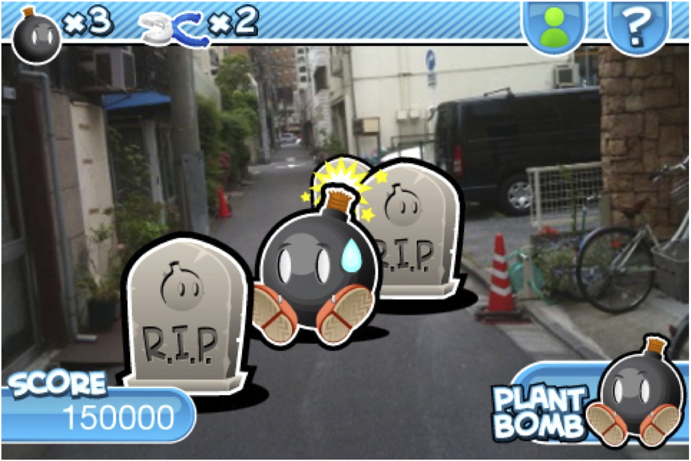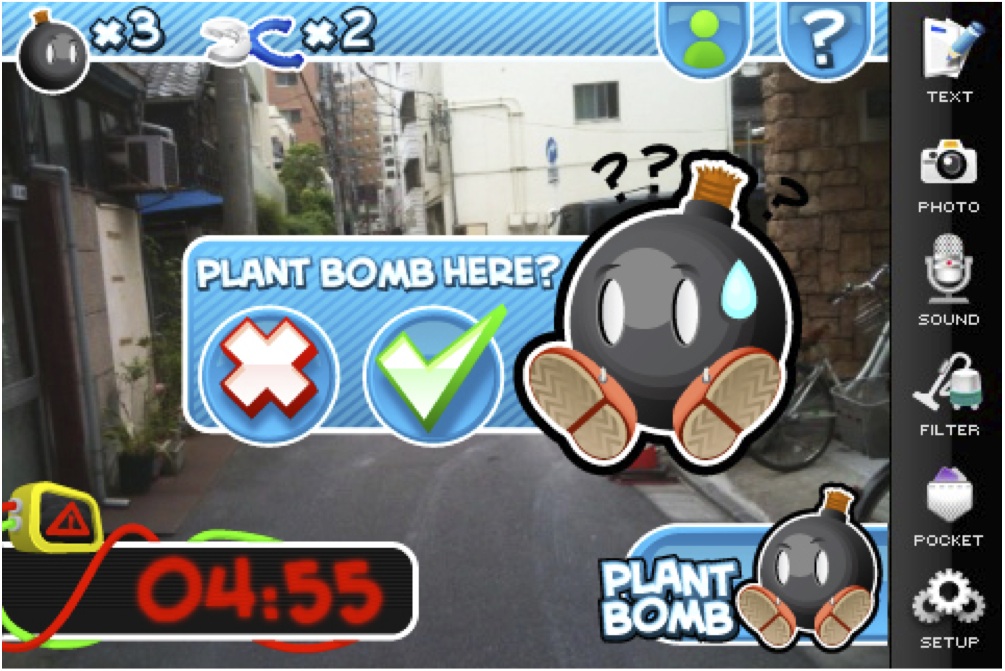 But perhaps most importantly, it features the first game that works within the Sekai Camera ecosystem. Tonchidot says that the title, a casual game called “KA-BOOM” (screenshots below), is just the first in a series of “Sekai Apps” that will be launched in the near future. The basic idea is to roll out games that combine mobile, location, augmented reality and social elements within Sekai Camera. Augmented reality-based gaming is something that has the potential to become huge and that no other company has ventured into on this scale. Tonchidot calls this concept “SoLAR” gaming and has already signed on a number of Japanese gaming firms that will deliver more content in the coming weeks.