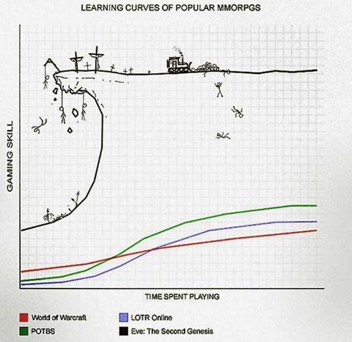 “There’s two axes to that graph,” says Gylfason. “One of them is simply the complexity of the game. You have all these things, including conversations with other players. But that’s not really too different from any other MMO out there. There’s a lot of stuff to do, obviously. There’s all these things you have to realize like health bars, weapons systems, travel times, and stuff like that. The other part of it is maybe the sheer size of the Eve universe and the options that are available to you.”