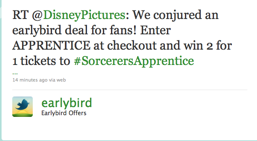 Last week we learned more about Twitter’s ecommerce deal product, @EarlyBird. Earlybird will offer users exclusive, time-bound deals, events and sneak peeks, for which it has partnered with a number of advertising partners. Today, EalryBird is taking flight with its first deal, tickets for “The Sorcerer’s Apprentice,” a film from Walt Disney Pictures and Jerry Bruckheimer Films that opens in theaters today. According to the Tweet, if you enter “APPRENTICE” at checkout on Fandago, you’ll get two tickets for the price of one.