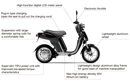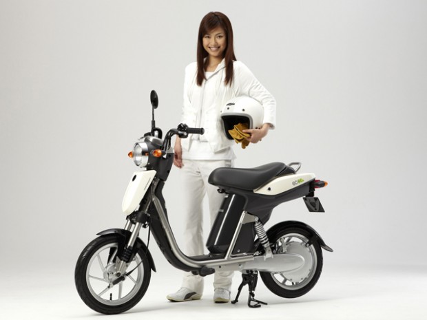 Yamaha Japan announced [press release in English] the EC-03 today, an electric 50cc scooter that’s powered by a 50V/14Ah lithium ion battery. The vehicle has a driving range of 43km (at 30km/h on flat roads) per charge. A charge takes six hours, with Yamaha saying that a household electrical outlet (100V) is all you need.