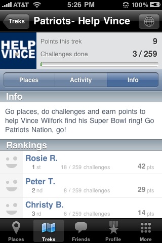 You see, starting today the Patriots are running a large-scale Help Vince campaign across New England as the team looks to engage its fans in the offseason. And to do that, it’s turning to SCVNGR to power an array of Patriots-themed location based challenges, badges, and treks as users vie for prizes, which include a grand prize lunch with a member of the Patriots squad. The Patriots will be promoting the ‘Help Vince’ campaign across New England with TV spots, billboards, and more. You can see the team’s site dedicated to the campaign here.