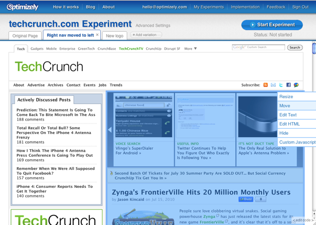 Getting started with Optimizely is surprisingly easy. After logging in and hitting the ‘Create Experiement’ tab, the service asks you to choose which website you want to run an A/B test on. Optimizely will then load that site, but with a key change: as you move your mouse over each part of the page (text, images, etc.) you’ll notice a light blue cursor highlighting each element. Click an element, and you’ll see a menu that lets you modify the element’s position or size, its image or text, or its Javascript.
