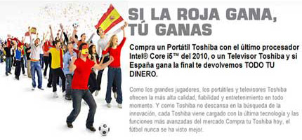 Toshiba made a bit of a mistake back in early June. They ran a series of ads in Germany, England, Portugal, Italy, and Spain, promising that if someone bought a Toshiba product before the end of the World Cup, and your team won it, Toshiba would refund your purchase. Sounds like a great deal, right? Well.. you’ve got to read that fine print.